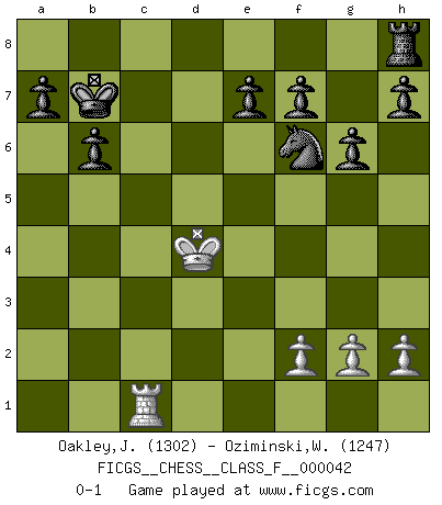 Last move : 0-1 2007 November 5 14:49:44 [Event "FICGS__CHESS__CLASS_F__000042"] [Site "FICGS"] [Date "2007.06.30"] [Round "1"] [White "Oakley,Johnny"] [Black "Oziminski,Wojciech"] [Result "0-1"] [WhiteElo "1302"] [BlackElo "1247"] 1.e4 c5 2.b4 cxb4 3.a3 d5 4.e5 Nc6 5.d4 g6 6.axb4 Nxb4 7.c4 Bg7 8.Qa4+ Nc6 9.cxd5 Qxd5 10.Nc3 Qxd4 11.Nb5 Qxe5+ 12.Be2 Qxa1 13.Qxa1 Bxa1 14.Nc7+ Kd7 15.Nxa8 b6 16.Be3 Bd4 17.Kd2 Bb7 18.Bb5 Bxe3+ 19.Kxe3 Bxa8 20.Ne2 Ke6 21.Bxc6 Bxc6 22.Nd4+ Kd6 23.Nxc6 Kxc6 24.Rc1+ Kb7 25.Kd4 Nf6 0-1 Sicilian : wing gambit, Marshall variation Player Black won this chess game. Follow this game move after move (download)When the Chess game is over, the Pawn and the King go back to the same box. (Irish saying) Früher wurde jeder komplizierte Zug, jedes interessante Opfer mit großem Beifall und Enthusiasmus aufgenommen. Heute schaltet man einfach seinen Fritz an, und man kann sehen, was los ist, ob der Zug geht oder nicht. (Vladimir Kramnik) Un entendimiento minucioso de las típicas continuaciones de mate hacen de las mas complicadas combinaciones de sacrificio que conducen hacia ellas no solo no dificiles, sino casi un asunto de rutina. (Siegbert Tarrasch) Soyez une menace à chaque fois que vous vous asseyez pour jouer. (Ken Smith) Memory is a crazy woman that hoards colored rags and throws away food. (Austin O'Malley)