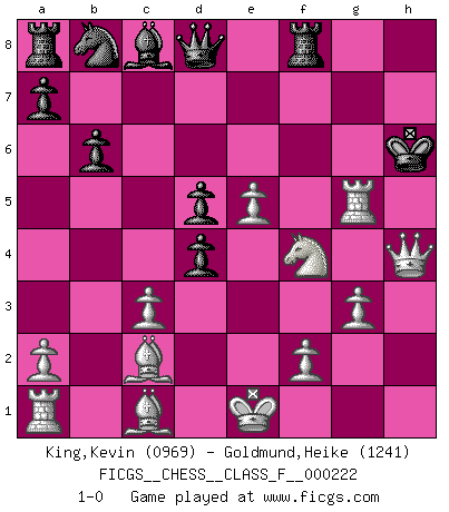 Last move : 1-0 2020 January 20 16:25:37 [Event "FICGS__CHESS__CLASS_F__000222"] [Site "FICGS"] [Date "2019.12.15"] [Round "1"] [White "King,Kevin"] [Black "Goldmund,Heike"] [Result "1-0"] [WhiteElo "0969"] [BlackElo "1241"] 1.d4 Nf6 2.c4 e6 3.Nc3 b6 4.e4 d5 5.cxd5 exd5 6.e5 Ne4 7.Bd3 Nxc3 8.bxc3 c5 9.Ne2 Be7 10.Nf4 O-O 11.Qc2 Bb7 12.Bxh7+ Kh8 13.Qf5 Bg5 14.Qh3 Bh4 15.Bc2 Bc8 16.Qf3 g6 17.g3 Be7 18.h4 Kg7 19.h5 cxd4 20.hxg6 fxg6 21.Rh6 Bg5 22.Rxg6+ Kh7 23.Qh1+ Bh4 24.Rg5 Kh6 25.Qxh4+ 1-0 Queen's pawn game Kingside Castling by player Black (move 10) Player White won this chess game. Follow this game move after move (download)By playing at Chess then, we may learn: First: Foresight... Second: Circumspection... Third: Caution... And lastly, we learn by Chess the habit of not being discouraged by present bad appearances in the state of our affairs, the habit of hoping for a favorable chance, and that of persevering in the secrets of resources. (Benjamin Franklin) Schach ist ein schwarz-weisser Dschungel. (Garry Kasparov) Peones: ellos son el alma de esta partida, solos forman el ataque y la defensa. (Philidor) Il a essayé de se convaincre qu'il pourrait empêcher toutes les erreurs et ne jamais perdre. L'horreur ! Gary Kasparov au sujet de Robert Fischer. Wisdom doesn't necessarily come with age. Sometimes age just shows up all by itself. (Tom Wilson)