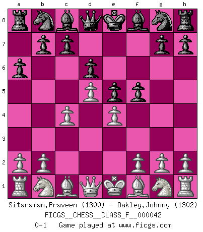 Last move : 0-1 2007 August 17 22:20:23 [Event "FICGS__CHESS__CLASS_F__000042"] [Site "FICGS"] [Date "2007.06.30"] [Round "1"] [White "Sitaraman,Praveen"] [Black "Oakley,Johnny"] [Result "0-1"] [WhiteElo "1300"] [BlackElo "1302"] 1.d4 a6 2.c4 d6 3.d5 e5 4.e4 f5 0-1 Queen's pawn Player Black won this chess game. Follow this game move after move (download)A man that will take back a move at Chess will pick a pocket. (Richard Fenton) Heutzutage gewinnt im Turnier nicht derjenige Spieler, der weitreichende Pläne entwirft, sondern einfach jener, der Zug um Zug kämpft. (David Bronstein) El Ajedrez lo es todo: arte, ciencia y deporte. (Anatoly Karpov) Echiquier : carré parfait, comme la Jérusalem nouvelle décrite par l'auteur de l'Apocalypse, huit cases sur huit, exaltation du chiffre 4, symbole du cosmos aux quatre horizons... où le noir et le blanc, l'ombre et la lumière, le mal et le bien s'entremêlent et se conjuguent. (Robert Couffignal, Le Gambit du poète) Warrior pose battles inner weakness and wins focus. You see that there is no war within you. You're on your own side, and you are your own strength. (Terri Guillemets)