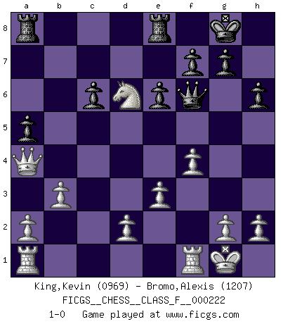 Last move : 1-0 2020 January 3 18:41:51 [Event "FICGS__CHESS__CLASS_F__000222"] [Site "FICGS"] [Date "2019.12.15"] [Round "1"] [White "King,Kevin"] [Black "Bromo,Alexis"] [Result "1-0"] [WhiteElo "0969"] [BlackElo "1207"] 1.f4 d5 2.Nf3 c5 3.b3 Nf6 4.e3 Nc6 5.Bb2 Bg4 6.Bd3 e6 7.O-O Bd6 8.Be2 O-O 9.Na3 a6 10.c4 Re8 11.Nc2 h6 12.Ne5 Bxe2 13.Qxe2 dxc4 14.Nxc6 bxc6 15.Bxf6 Qxf6 16.Qxc4 a5 17.Na3 Qb2 18.Qa4 c4 19.Nxc4 Qf6 20.Nxd6 1-0 Bird's Opening Kingside Castling by player White (move 7) Kingside Castling by player Black (move 8) Player White won this chess game. Follow this game move after move (download)A man without frontiers. He didn't divide the East and the West, he brought them together in their admiration for him. (Ljubomir Ljubojevic, about Bobby Fischer's death) Ja, ich habe einmal eine Blitzpartie gespielt, es war in einem Zug, 1929. --im Interview 1989 (Mikhail Moiseyevich Botvinik) El Ajedrez te enseña a controlarl la excitación inicial que sientes cuando vez algo que parece bueno y te enseña a pensar objetivamente cuando te encuentras en problemas. (Stanley Kubrick) On entre au jeu d'Echecs comme on entre en Religion. Pour le joueur d'Echecs, la partie d'Echecs c'est l'office, la messe, le défilé du 1er Mai, le dépôt de gerbe au Monument aux Morts. C'est un drame sacré. (Michel Roos) Internal peace cannot coexist with external war. (Don Groves)