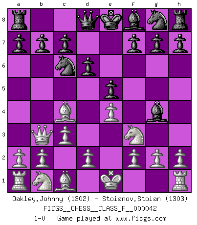 Last move : 1-0 2007 August 29 12:5:53 [Event "FICGS__CHESS__CLASS_F__000042"] [Site "FICGS"] [Date "2007.06.30"] [Round "1"] [White "Oakley,Johnny"] [Black "Stoianov,Stoian"] [Result "1-0"] [WhiteElo "1302"] [BlackElo "1303"] 1.e4 e5 2.Nf3 d6 3.Bc4 Nc6 4.c3 Bg4 5.Qb3 1-0 This chess game has been lost on time (started : 2007.06.30 18:7:31) Philidor's defense Player White won this chess game. Follow this game move after move (download)The stomach is an essential part of the Chess master. (Bent Larsen) Im Wettkampf zwischen starken Meistern kommen Fehler sehr selten vor, deshalb ist es mit bloßem Warten nicht getan. (José Raúl Capablanca) Ayuda a tus piezas para que ellas te puedan ayudar. (Paul Morphy) Horreur, mais aussi harmonie suprême : qu'y avait-il en effet au monde en dehors des échecs ? Le brouillard, l'inconnu, le non-être... (Vladimir Nabokov) Those who make the worst use of their time are the first to complain of its brevity. (Jean de la Bruyere)