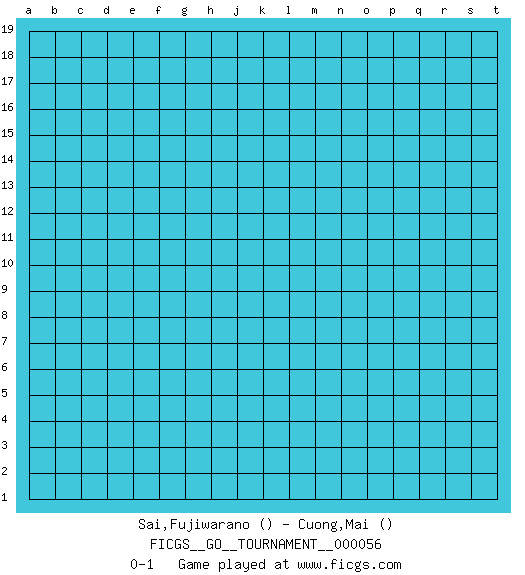 Last move : 0-1 2020 January 16 9:34:31 [Event "FICGS__GO__TOURNAMENT__000056"] [Site "FICGS"] [Date "2019.12.16"] [Round "1"] [Black "Sai,Fujiwarano"] [White "Cuong,Mai"] [Result "0-1"] 0-1 This go game has been lost on time (started : 2019.12.16 19:52:45) Here are the names of the openings (joseki) played in the four corners : Player White won this Go (weiqi, baduk) game. Follow this game move after move (download)Empty triangles are bad. (Anonymous) There are two types of people in this world, good and bad. The good sleep better, but the bad seem to enjoy the waking hours much more. (Woody Allen)