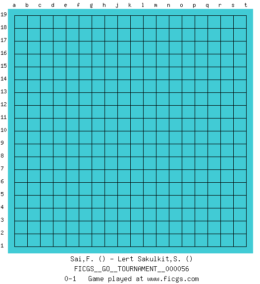 Last move : 0-1 2020 January 16 9:34:31 [Event "FICGS__GO__TOURNAMENT__000056"] [Site "FICGS"] [Date "2019.12.16"] [Round "1"] [Black "Sai,Fujiwarano"] [White "Lert Sakulkit,Sirilak"] [Result "0-1"] 0-1 This go game has been lost on time (started : 2019.12.16 19:52:45) Here are the names of the openings (joseki) played in the four corners : Player White won this Go (weiqi, baduk) game. Follow this game move after move (download)Don't make territory near thickness. (Anonymous) Go and wake up your luck. (Persian saying)