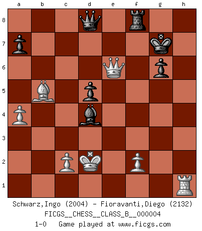 Last move : 1-0 2006 August 15 19:12:56 [Event "FICGS__CHESS__CLASS_B__000004"] [Site "FICGS"] [Date "2006.06.19"] [Round "1"] [White "Schwarz,Ingo"] [Black "Fioravanti,Diego"] [Result "1-0"] [WhiteElo "2004"] [BlackElo "2132"] 1.e4 d6 2.Bc4 c6 3.Nc3 Nf6 4.a4 d5 5.exd5 cxd5 6.Bb5+ Nc6 7.d4 Bf5 8.Nf3 e6 9.Ne5 Nd7 10.Nxc6 bxc6 11.Bxc6 Rc8 12.Bb5 Bd6 13.Qe2 O-O 14.g4 Bg6 15.h4 Bb4 16.h5 Rxc3 17.bxc3 Bxc3 18.Bd2 Bxa1 19.hxg6 Bxd4 20.Qd3 Ne5 21.Qh3 h6 22.g5 fxg6 23.Qxe6+ Kh7 24.gxh6 Nf3 25.Kd1 Nxd2 26.hxg7 Kxg7 27.Kxd2 1-0 King's pawn Opening Kingside Castling by player Black (move 13) Player White won this chess game. Follow this game move after move (download)We like to think. (Gary Kasparov) Ich tröste mich mit dem Vergnügen, daß Schachfans, Zuschauer und Leser glücklich sind, wenn ein Großmeister etwas riskiert, statt nur Klötzchen zu schieben. (Mikhail Nekhemyevich Tal) a manera como él juega al Ajedrez, demuestra la completa naturaleza de un hombre. (Stanley Ellin) Si le désir cupide (et stupide) de gagner est une inépuisable source de souffrance, une combinaison brillante sur l'échiquier est une découverte : le coquelicot qui s'épanouit lorsque apparaît la Voie Lactée. (Arrabal) Luck never gives; it only lends. (Swedish proverb)