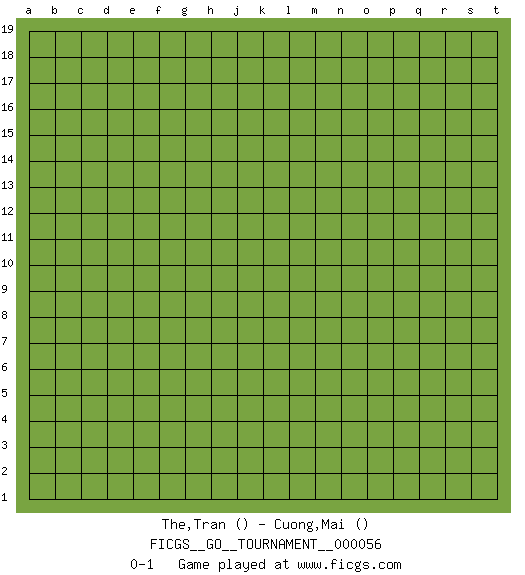 Last move : 0-1 2020 January 16 9:34:31 [Event "FICGS__GO__TOURNAMENT__000056"] [Site "FICGS"] [Date "2019.12.16"] [Round "1"] [Black "The,Tran"] [White "Cuong,Mai"] [Result "0-1"] 0-1 This go game has been lost on time (started : 2019.12.16 19:52:45) Here are the names of the openings (joseki) played in the four corners : Player White won this Go (weiqi, baduk) game. Follow this game move after move (download)Use a wall to attack, not to make territory. (Anonymous) Those parts of the system that you can hit with a hammer (not advised) are called hardware; those program instructions that you can only curse at are called software. (Anonymous)