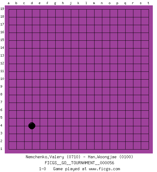 Last move : 1-0 2020 January 16 9:34:31 [Event "FICGS__GO__TOURNAMENT__000056"] [Site "FICGS"] [Date "2019.12.16"] [Round "1"] [Black "Nemchenko,Valery"] [White "Han,Woongjae"] [Result "1-0"] [Rating 1 "0710"] [Rating 2 "0100"] 1.d4 1-0 This go game has been lost on time (started : 2019.12.16 19:52:45) Here are the names of the openings (joseki) played in the four corners : Corner d4 : d4 1-0 Hoshi (Hwajeom, Seongjeom, Xingwei`) 4-4 Point. The star or hoshi (4-4) point, emphasizing influence at the potential expense of territory. Player Black won this Go (weiqi, baduk) game. Follow this game move after move (download)Don't make dango's. (Anonymous) I believe in luck. How else can you explain the success of those you dislike ? (Jean Cocteau)