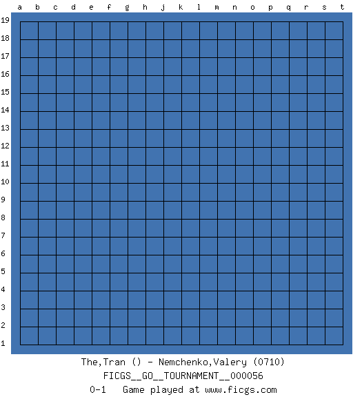 Last move : 0-1 2020 January 16 9:34:31 [Event "FICGS__GO__TOURNAMENT__000056"] [Site "FICGS"] [Date "2019.12.16"] [Round "1"] [Black "The,Tran"] [White "Nemchenko,Valery"] [Result "0-1"] [Rating 2 "0710"] 0-1 This go game has been lost on time (started : 2019.12.16 19:52:45) Here are the names of the openings (joseki) played in the four corners : Player White won this Go (weiqi, baduk) game. Follow this game move after move (download)The poor player plays the opponent's game for him. (Anonymous) There is no vagueness without wind. (Chinese proverb)