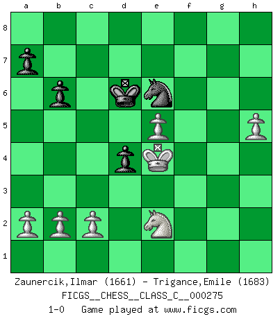 Last move : 1-0 2020 January 20 10:40:59 [Event "FICGS__CHESS__CLASS_C__000275"] [Site "FICGS"] [Date "2019.12.18"] [Round "1"] [White "Zaunercik,Ilmar"] [Black "Trigance,Emile"] [Result "1-0"] [WhiteElo "1661"] [BlackElo "1683"] 1.e4 e5 2.Nf3 f5 3.exf5 e4 4.Ne5 Nf6 5.Be2 d6 6.Bh5+ Ke7 7.Nf7 Qe8 8.Nxh8 Qxh5 9.Qxh5 Nxh5 10.g4 Nf6 11.h3 Nc6 12.Nc3 Nd4 13.Kd1 b6 14.Re1 Nf3 15.Re3 d5 16.Ne2 d4 17.Rb3 Ke8 18.d3 Bb7 19.g5 Nd7 20.dxe4 Bxe4 21.Ng3 Bd5 22.Rb5 c6 23.Rxd5 cxd5 24.g6 Nf6 25.Ke2 Ne5 26.Bf4 Bd6 27.Re1 Kf8 28.Kf1 Nc4 29.Bxd6+ Nxd6 30.gxh7 Nxh7 31.Ng6+ Kg8 32.Ne7+ Kf8 33.Ng6+ Kg8 34.Ne7+ Kf8 35.Nxd5 Re8 36.Rxe8+ Kxe8 37.Ke2 Kd7 38.h4 Kc6 39.Nf4 Nf8 40.h5 Nf7 41.Ne4 Nd6 42.f6 gxf6 43.Nxf6 Nf7 44.Kd3 Kc5 45.Ne2 Ne6 46.f4 Nh6 47.Ke4 Nf7 48.Nd7+ Kd6 49.Ne5 Nxe5 50.fxe5+ 1-0 Latvian counter-gambit Player White won this chess game. Follow this game move after move (download)The most powerful weapon in Chess is to have the next move. (David Bronstein) Nach Morphy wurde nichts neues mehr in der Behandlung offener Positionen gefunden. (Mikhail Moiseyevich Botvinik) Las combinaciones han sido siempre el aspecto más intrigante del Ajedrez. Los Maestros las buscan, el público las aplauden, los críticos las alaban. La razón se debe a que las combinaciones hacen posible que el Ajedrez sea más que un ejercicio matemático con una carencia de vida. Ellas son la poesía del juego, son del Ajedrez lo que la melodía es de la música. Ellas representan el triunfo de la mente sobre la materia. (Reuben Fine) Que feriez-vous si vous étiez en train de jouer aux échecs et que la fin du monde arrive ? Je continuerais à jouer. (Saint Borromée) I would love to change the world, but they won't give me the source code. (Unknown)