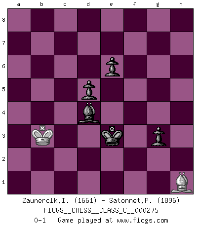 Last move : 0-1 2020 February 16 17:3:27 [Event "FICGS__CHESS__CLASS_C__000275"] [Site "FICGS"] [Date "2019.12.18"] [Round "1"] [White "Zaunercik,Ilmar"] [Black "Satonnet,Patrick"] [Result "0-1"] [WhiteElo "1661"] [BlackElo "1896"] 1.e4 c5 2.c3 Nf6 3.d3 Nc6 4.Nf3 e6 5.Be2 Qc7 6.O-O Be7 7.Nbd2 d5 8.Qc2 Bd7 9.d4 cxd4 10.cxd4 Rc8 11.e5 Nxe5 12.Qxc7 Nxf3+ 13.Nxf3 Rxc7 14.Bf4 Rc8 15.Rac1 O-O 16.Ne5 Rxc1 17.Rxc1 Rc8 18.Nxd7 Rxc1+ 19.Bxc1 Nxd7 20.Be3 Nb8 21.Kf1 g5 22.Bb5 f5 23.f4 h6 24.h3 a6 25.Ba4 Kf7 26.g3 Bf6 27.Ke2 g4 28.hxg4 fxg4 29.Kd3 h5 30.Bf2 Nc6 31.Bd1 Bh8 32.a3 Ne7 33.a4 Bg7 34.b4 Nc6 35.Kc3 Bf8 36.b5 axb5 37.axb5 Ne7 38.Bc2 Nf5 39.Kd2 Bg7 40.Kc3 Bf6 41.Bd1 Nd6 42.Kd3 Nxb5 43.Bc2 Be7 44.Ba4 Nd6 45.Bd1 Nf5 46.Bc2 h4 47.gxh4 Bxh4 48.Bg1 Kg6 49.Bd1 g3 50.Bf3 b5 51.Be3 Nxe3 52.Kxe3 b4 53.Kd3 Kf5 54.Ke3 b3 55.Kd2 Kxf4 56.Bh1 Bf6 57.Kc3 Ke3 58.Kxb3 Bxd4 0-1 Sicilian : Alapin's variation (2.c3) Kingside Castling by player White (move 6) Kingside Castling by player Black (move 15) 10 pieces endgame at move 52 : White KBPP , Black KBPPPP WHITE : King + 1 Bishop 2 Pawns BLACK : King + 1 Bishop 4 Pawns 9 pieces endgame at move 55 : White KBP , Black KBPPPP WHITE : King + 1 Bishop 1 Pawn BLACK : King + 1 Bishop 4 Pawns 8 pieces endgame at move 58 : White KBP , Black KBPPP WHITE : King + 1 Bishop 1 Pawn BLACK : King + 1 Bishop 3 Pawns 7 pieces endgame at move 58 : White KB , Black KBPPP WHITE : King + 1 Bishop BLACK : King + 1 Bishop 3 Pawns Player Black won this chess game. Follow this game move after move (download)Castle early and often. (Rob Sillars) Der Schachmeister von Heute braucht Courage, einen Killerinstinkt, Ausdauer und Arroganz. (Larry Evans) De todos mis libros Rusos, la defensa contiene y difunde el 'calor' mas grande que pudiese verse extraño al observar lo supremamente abstracto que el Ajedrez supuestamente es. (Vladimir Nabokov) Les Echecs sont affaire de jugement sensible. Savoir quand frapper et quand esquiver. (Fischer) Warrior pose battles inner weakness and wins focus. You see that there is no war within you. You're on your own side, and you are your own strength. (Terri Guillemets)
