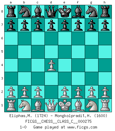Last move : 1-0 2020 January 28 2:17:58 [Event "FICGS__CHESS__CLASS_C__000275"] [Site "FICGS"] [Date "2019.12.18"] [Round "1"] [White "Eliphas,Matthew"] [Black "Mongkolpradit,Harris"] [Result "1-0"] [WhiteElo "1724"] [BlackElo "1600"] 1.d4 1-0 This chess game has been lost on time (started : 2019.12.18 2:1:16) Queen's pawn Player White won this chess game. Follow this game move after move (download)I am the best player in the world and I am here to prove it. (Bobby Fischer) Ich könnte leicht behaupten: Ja,ja, Leonid Breschnew wollte nicht, daß ich Weltmeister werde. In der Tat war die Sache komplizierter. (Viktor Kortschnoi) ¿Porque tengo que perder ante este idiota?. (Aron Nimzovich) La vie et les Echecs sont tous les deux une lutte constante. (Lasker) Ah, the Socrating method. The best way we have of teaching everything-apart from juggling chainsaws. (Gregory House, House M.D.)