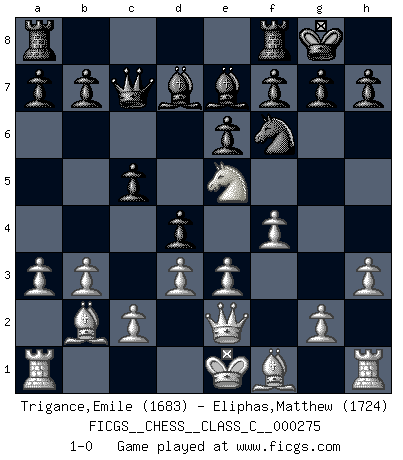 Last move : 1-0 2020 March 1 15:22:19 [Event "FICGS__CHESS__CLASS_C__000275"] [Site "FICGS"] [Date "2019.12.18"] [Round "1"] [White "Trigance,Emile"] [Black "Eliphas,Matthew"] [Result "1-0"] [WhiteElo "1683"] [BlackElo "1724"] 1.f4 e6 2.Nf3 d5 3.b3 c5 4.Bb2 Nc6 5.e3 Nf6 6.d3 Be7 7.Qe2 Bd7 8.Nbd2 O-O 9.a3 Qb6 10.h3 d4 11.Nc4 Qc7 12.Nfe5 Nxe5 13.Nxe5 1-0 Bird's Opening Kingside Castling by player Black (move 8) Player White won this chess game. Follow this game move after move (download)Modern Chess is too much concerned with things like Pawn structure. Forget it, Checkmate ends the game. (Nigel Short) Schachspieler können ausgezeichnet Varianten am Schachbrett berechnen, aber nicht im realen Leben. Zu stark ist der Individualismus im Schach ausgeprägt, und für viele ist ein kleiner momentaner persönlicher Vorteil wichtiger als ein weit größerer Vorteil von morgen. (Anatoly Karpov) El Ajedrez era la lengua materna de Capablanca. (Reti) Donnez-moi un Cavalier en 6e et je gagnerais toutes mes parties. (Steinitz) A generalist learns less and less about more and more until he knows nothing about everything. (Author unknown)