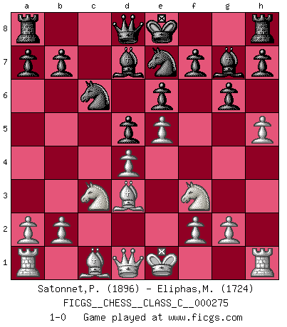 Last move : 1-0 2020 February 4 3:57:28 [Event "FICGS__CHESS__CLASS_C__000275"] [Site "FICGS"] [Date "2019.12.18"] [Round "1"] [White "Satonnet,Patrick"] [Black "Eliphas,Matthew"] [Result "1-0"] [WhiteElo "1896"] [BlackElo "1724"] 1.e4 e6 2.d4 d5 3.e5 c5 4.c3 Nc6 5.Nf3 cxd4 6.cxd4 Nge7 7.Bd3 g6 8.Nc3 Bg7 9.h4 Bd7 10.h5 1-0 This chess game has been lost on time (started : 2019.12.18 2:1:16) French : Advance, Paulsen attack Player White won this chess game. Follow this game move after move (download)Different people feel differently about resigning. (Bobby Fischer) Wenn Capablanka heute auf der Schachbühne erscheinen würde, hätte er ein halbes Jahr gebraucht um sich die Schachtheorie anzueignen. Und dann hätte er alles und jeden besiegt. (Mikhail Moiseyevich Botvinik) Hay dos clases de hombres: aquellos que se conforman en dejarse llevar por las circunstancias y que juegan barajas y aquellos decididos a controlar las circunstancias y que juegan al Ajedrez. (Mortimer Collins) Le système Elo représente seulement une moyenne. Il est simplement un indicateur de votre stabilité. (Anatoli Karpov) Faith : not wanting to know what is true. (Friedrich Nietzsche)
