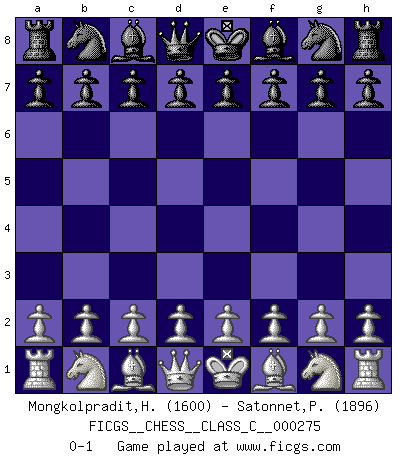 Last move : 0-1 2020 January 27 2:7:0 [Event "FICGS__CHESS__CLASS_C__000275"] [Site "FICGS"] [Date "2019.12.18"] [Round "1"] [White "Mongkolpradit,Harris"] [Black "Satonnet,Patrick"] [Result "0-1"] [WhiteElo "1600"] [BlackElo "1896"] 0-1 This chess game has been lost on time (started : 2019.12.18 2:1:16) Player Black won this chess game. Follow this game move after move (download)Chess is as much a mystery as women. (Purdy) Kein Großmeister ist normal. Sie unterscheiden sich nur im Ausmaß Ihrer Verrücktheit. (Viktor Kortschnoi) El juego de Damas es para vagabundos. (Paul Morphy) En blitz, le Cavalier l'emporte sur le Fou. (Vlastimil Hort) Success without honor is an unseasoned dish; it will satisfy your hunger, but it won't taste good. (Joe Paterno)