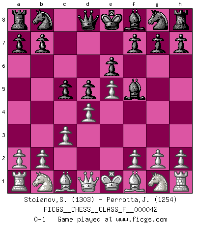 Last move : 0-1 2007 August 22 4:53:39 [Event "FICGS__CHESS__CLASS_F__000042"] [Site "FICGS"] [Date "2007.06.30"] [Round "1"] [White "Stoianov,Stoian"] [Black "Perrotta,John Zach"] [Result "0-1"] [WhiteElo "1303"] [BlackElo "1254"] 1.e4 c5 2.c3 d5 3.e5 Bf5 4.d4 e6 0-1 This chess game has been lost on time (started : 2007.06.30 18:7:31) Sicilian : Alapin's variation (2.c3) Player Black won this chess game. Follow this game move after move (download)Human affairs are like a Chess game: only those who do not take it seriously can be called good players. (Hung Tzu Ch'eng) Es hat in meinem Leben Zeiten gegeben, in denen das Schachspiel, wenn nicht zum Lebenszweck, so doch zu einem regelrechten Lebensersatz geworden ist. Man fühlt sich in solchen Zeiten nicht so, als besäße man eine göttliche Gabe, sondern eher so, als sei man von ihr besessen. (Garry Kasparov) Una victoria por una combinación errónea, aunque sea espectacular, me llena de horror artístico. (Wilhelm Steinitz) Dieu déplace le joueur, et celui-ci la pièce. Quel Dieu derrière Dieu commence donc la trame ? Arturo Perez-Reverte (prix de littérature policière 1993). Faith : not wanting to know what is true. (Friedrich Nietzsche)