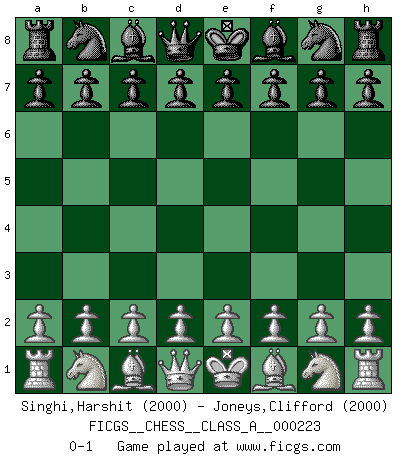 Last move : 0-1 2020 February 1 4:27:23 [Event "FICGS__CHESS__CLASS_A__000223"] [Site "FICGS"] [Date "2019.12.22"] [Round "1"] [White "Singhi,Harshit"] [Black "Joneys,Clifford"] [Result "0-1"] [WhiteElo "2000"] [BlackElo "2000"] 0-1 This chess game has been lost on time (started : 2019.12.22 19:38:10) Player Black won this chess game. Follow this game move after move (download)In Chess, just as in life, today's bliss may be tomorrow's poison. (Assaic) Verschiedene, sehr schätzbare und im Laufe des Lebens nützliche Eigenschaften des Geistes können durch das Schachspiel erworben und gekräftigt werden, so dass sie zu Gewohnheiten werden, die uns nie im Stich lassen. (Benjamin Franklin) El Ajedrez es una hermosa aventura. (Bent Larsen) Même un GMI sait rarement calculer sur plus de cinq coups une attaque à sacrifices. (Rudolf Spielmann) Heh, heh, heh. Time to abandon ship. (General Grievous in Star Wars ep.3)
