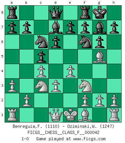 Last move : 1-0 2007 August 30 12:16:42 [Event "FICGS__CHESS__CLASS_F__000042"] [Site "FICGS"] [Date "2007.06.30"] [Round "1"] [White "Benreguia,Frederic"] [Black "Oziminski,Wojciech"] [Result "1-0"] [WhiteElo "1110"] [BlackElo "1247"] 1.c4 c5 2.Qa4 Nf6 3.d3 Nc6 4.e4 d6 5.Nc3 Bd7 6.Nf3 g6 7.Bg5 Bg7 8.a3 O-O 9.Qd1 1-0 This chess game has been lost on time (started : 2007.06.30 18:7:31) English : Symmetrical variation Kingside Castling by player Black (move 8) Player White won this chess game. Follow this game move after move (download)Chess is above all, a fight ! (Emanuel Lasker) Dieses schreckliche Gefühl, dass ich gegen eine Maschine spielte, die niemals Fehler macht, zerschmetterte meinen Widerstand. (Mark Taimanov) No hay otro maestro que tenga una voluntad terrífica de ganar. Al tablero, el irradía peligro y aún los oponentes mas fuertes tienden a congelarse como liebres cuando olfatean a una pantera. Aún sus debilidades son peligrosas. Con las blancas, su juego de apertura es predecible - te es posible hacer planes en su contra - pero es tan fuerte que tus planes casi nunca funcionan. En el juego medio, su precisión e invención son fabulosas y en finales, tú simplemente no le puedes vencer. (Experto Alemán anónimo) Votre seul travail dans les ouvertures est d'obtenir un milieu de partie jouable. (Lajos Portish) When it is a question of money, everybody is of the same religion. (Voltaire)