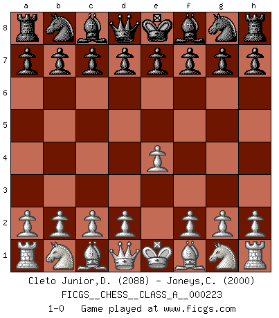 Last move : 1-0 2020 February 1 4:27:23 [Event "FICGS__CHESS__CLASS_A__000223"] [Site "FICGS"] [Date "2019.12.22"] [Round "1"] [White "Cleto Junior,Dirceu"] [Black "Joneys,Clifford"] [Result "1-0"] [WhiteElo "2088"] [BlackElo "2000"] 1.e4 1-0 This chess game has been lost on time (started : 2019.12.22 19:38:10) King's pawn Opening Player White won this chess game. Follow this game move after move (download)A sacrifice is best refuted by accepting it. (Wilhelm Steinitz) Schach ist gnadenlos. Du mußt bereit sein zu töten. (Nigel Short) Cada Peón es una Reina en potencia. (James Mason) Même si l'adversaire joue le coup analysé précédemment, recommencez l'analyse en voyant la nouvelle position. Première règle de Blumenfeld The beginning of wisdom is silence. The second step is listening. (Unknown)