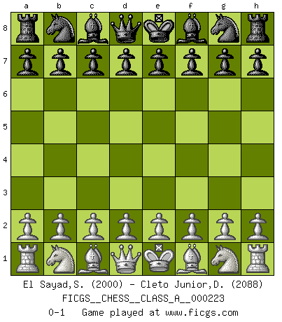 Last move : 0-1 2020 February 1 4:27:23 [Event "FICGS__CHESS__CLASS_A__000223"] [Site "FICGS"] [Date "2019.12.22"] [Round "1"] [White "El Sayad,Sherief"] [Black "Cleto Junior,Dirceu"] [Result "0-1"] [WhiteElo "2000"] [BlackElo "2088"] 0-1 This chess game has been lost on time (started : 2019.12.22 19:38:10) Player Black won this chess game. Follow this game move after move (download)If Chess is a science, it's a most inexact one. If Chess is an art, it is too exacting to be seen as one. If Chess is a sport, it's too esoteric. If Chess is a game, it's too demanding to be just a game. If Chess is a mistress, she's a demanding one. If Chess is a passion, it's a rewarding one. If Chess is life, it's a sad one. (Unknown) Man wirke der falschen Auffassung entgegen, als ob jeder Zug Unmittelbares zu leisten habe; auch Werte- und Ruhezüge haben ihre Existenzberechtigung. (Aaron Nimzowitsch) La vida es como un juego de Ajedrez, cambiando con cada movimiento. (Proverbio Chino) Une platitude souvent récitée à propos des Echecs est qu'une des choses les plus difficiles à réaliser est de gagner une position gagnante. Cela ne manque pas de sens mais, pour ma part, j'ai toujours trouvé plus difficile de gagner une position perdante. (Tim Krabbe) There's always a bigger fish. (Qui-Gon Jinn in Star Wars ep.1)