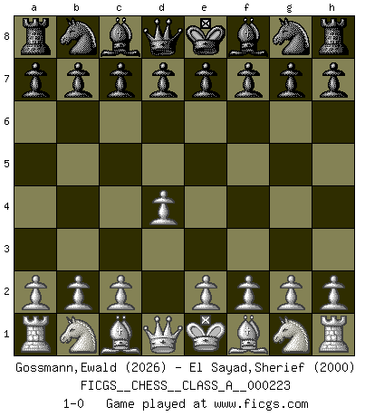Last move : 1-0 2020 February 1 17:40:57 [Event "FICGS__CHESS__CLASS_A__000223"] [Site "FICGS"] [Date "2019.12.22"] [Round "1"] [White "Gossmann,Ewald"] [Black "El Sayad,Sherief"] [Result "1-0"] [WhiteElo "2026"] [BlackElo "2000"] 1.d4 1-0 This chess game has been lost on time (started : 2019.12.22 19:38:10) Queen's pawn Player White won this chess game. Follow this game move after move (download)Suddenly it was obvious to me in my analysis I had missed what Fischer had found with the greatest of ease at the board. (Mikhail Botvinnik) Matt entspricht nicht immer den Tatsachen. (Savielly Grigorievitsch Tartakower) La maestría del Ajedrez consiste esencialmente en analizar posiciónes de Ajedrez con precisión. (Mikhail Botvinnik) Tout change constamment, y compris dans le monde des Echecs. (Botvinnik) The quality of decision is like the well-timed swoop of a falcon which enables it to strike and destroy its victim. (Sun Tzu)