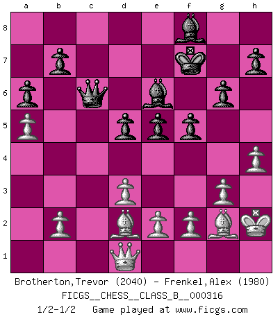 Last move : 1/2-1/2 2020 April 23 18:8:19 [Event "FICGS__CHESS__CLASS_B__000316"] [Site "FICGS"] [Date "2019.12.25"] [Round "1"] [White "Brotherton,Trevor"] [Black "Frenkel,Alex"] [Result "1/2-1/2"] [WhiteElo "2040"] [BlackElo "1980"] 1.g3 d5 2.Bg2 e5 3.d3 Nf6 4.Nf3 Nc6 5.O-O g6 6.c4 Bg7 7.cxd5 Nxd5 8.Bd2 O-O 9.Re1 Nd4 10.Nc3 Nxf3+ 11.Bxf3 c6 12.a4 Rb8 13.Bg2 Be6 14.Rb1 f5 15.Nxd5 cxd5 16.Rc1 Qd7 17.Qb3 Rbc8 18.a5 Rfd8 19.h4 Re8 20.Rf1 Bf8 21.Rxc8 Rxc8 22.Rc1 Rxc1+ 23.Bxc1 Kf7 24.Bd2 Qc6 25.Kh2 a6 26.Qd1 1/2-1/2 Benko's Opening Kingside Castling by player White (move 5) Kingside Castling by player Black (move 8) This chess game ended in a draw. Follow this game move after move (download)With or without the title, Bobby Fischer was unquestionably the greatest player of his time. (Burt Hochberg) Schach ist ein Reich, wo sich die menschliche Phantasie frei entfalten kann. (David Bronstein) No todos los artistas son jugadores de Ajedrez, pero todos los jugadores de Ajedrez son artistas. (Marcel Duchamp) La tactique, c'est ce que vous faites quand il y a quelque chose à faire; la stratégie, c'est ce que vous faites quand il n'y a rien à faire. (Savielli Tartacower) Every now and then a man's mind is stretched by a new idea and never shrinks back to its former dimensions. (Oliver Wendell Holmes, Sr.)