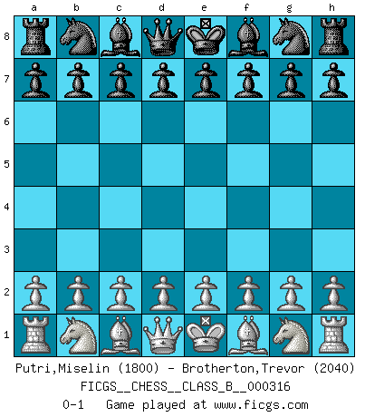 Last move : 0-1 2020 February 4 3:57:28 [Event "FICGS__CHESS__CLASS_B__000316"] [Site "FICGS"] [Date "2019.12.25"] [Round "1"] [White "Putri,Miselin"] [Black "Brotherton,Trevor"] [Result "0-1"] [WhiteElo "1800"] [BlackElo "2040"] 0-1 This chess game has been lost on time (started : 2019.12.25 22:25:9) Player Black won this chess game. Follow this game move after move (download)Chess is as much a mystery as women. (Purdy) Ein Schachgenie ist jemand der verdammt gut Schach spielt. (Jonathan Levitt) ¿Se han dado cuenta de que Fischer casi nunca ha tenido piezas malas? El las intercambia y las piezas malas se quedan con sus oponenets. (Yuri Balashov) Les échecs sont un jeu par leur forme, un art par leur essence et une science par sa difficulté d'acquisition. Ils peuvent vous procurer autant de plaisir qu'un bon livre ou une belle musique, mais vous n'aurez une réelle joie que si vous arrivez à bien jouer. (Tigran Petrosian) Difficult things take a long time, impossible things a little longer. (Author unknown)