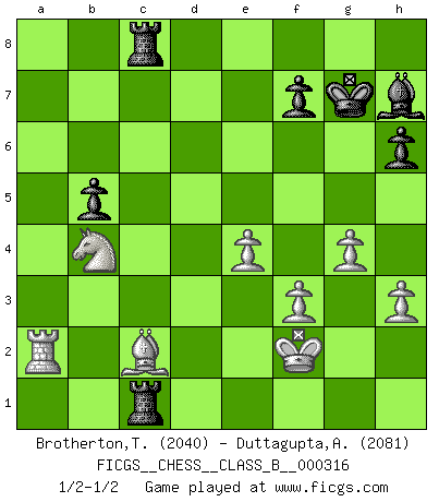 Last move : 1/2-1/2 2020 December 2 22:17:17 [Event "FICGS__CHESS__CLASS_B__000316"] [Site "FICGS"] [Date "2019.12.25"] [Round "1"] [White "Brotherton,Trevor"] [Black "Duttagupta,Aniruddha"] [Result "1/2-1/2"] [WhiteElo "2040"] [BlackElo "2081"] 1.g3 e5 2.Bg2 d5 3.d3 Nf6 4.Nf3 Bd6 5.O-O O-O 6.Nbd2 Re8 7.e4 c6 8.b3 h6 9.a4 Bg4 10.h3 Bh5 11.c3 a5 12.Qc2 Bg6 13.Nh4 Bh7 14.Rd1 Qd7 15.g4 Na6 16.Nf5 Bf8 17.Nf1 Rad8 18.Bd2 Nc5 19.b4 axb4 20.cxb4 Ne6 21.Qb2 Nf4 22.Bxf4 exf4 23.Nxh6+ gxh6 24.Qxf6 Bg7 25.Qxf4 Bxa1 26.Rxa1 dxe4 27.dxe4 Qd6 28.Qxd6 Rxd6 29.f3 Red8 30.b5 Rd1 31.Ra2 cxb5 32.axb5 Rb1 33.Kf2 Rxb5 34.Ne3 Rb3 35.Bf1 b5 36.Nd5 Rb8 37.Be2 Kg7 38.Bd1 Rb1 39.Bc2 Rc1 40.Nb4 Rc8 1/2-1/2 Follow this game move after move (download)Chess is above all, a fight ! (Emanuel Lasker) Woher wissen wir, daß der Neanderthaler Blindschach gespielt hat? -- Bei Ausgrabungen wurden keine Schachbretter und Figuren gefunden. (Anonymous) Aquellos que dicen que entienden al Ajedrez, no entienden nada. (Robert Hubner) Le génie consiste à savoir transgresser les règles au moment opportun. (Teichmann) When a man with money meets a man with experience, the man with experience leaves with money and the man with money leaves with experience. (Anonymous)