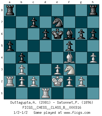 Last move : 1/2-1/2 2020 May 8 11:32:26 [Event "FICGS__CHESS__CLASS_B__000316"] [Site "FICGS"] [Date "2019.12.25"] [Round "1"] [White "Duttagupta,Aniruddha"] [Black "Satonnet,Patrick"] [Result "1/2-1/2"] [WhiteElo "2081"] [BlackElo "1896"] 1.d4 f5 2.Bg5 g6 3.Nc3 Bg7 4.h4 h6 5.Bf4 Nf6 6.e3 d6 7.Qf3 Nc6 8.Qg3 Kf7 9.O-O-O Qe8 10.Bc4+ e6 11.Nge2 a6 12.d5 b5 13.Bb3 b4 14.dxe6+ Bxe6 15.Nd5 Nxd5 16.Rxd5 Ne7 17.Ra5 Bxb3 18.axb3 Qc6 19.Rd1 Qb6 20.Ra2 Bf6 21.Qf3 Qc6 22.Nd4 Qxf3 23.Nxf3 a5 24.Kd2 Ke6 25.Ke2 1/2-1/2 Dutch, 2.Bg5 variation Queenside Castling by player White (move 9) This chess game ended in a draw. Follow this game move after move (download)All my games are real. (Bobby Fischer) Ich war schon mal beim Dopingtest. Da musste ich Urin abgeben, während Dritte zusahen. (Elisabeth Pähtz) Bobby es la celebridad menos entendida y malinterpretada que camina el la faz de esta tierra. (Yasser Seirawan) J'ai vu le vaincu d'Echecs jouer des années durant dans l'espoir de la fête de la victoire. Car tu es plus riche de ce qu'elle existe si même elle n'est point pour toi. Ainsi de la perle du fond des mers. (Antoine de Saint-Exupéry) Establishing goals is all right if you don't let them deprive you of interesting detours. (Doug Larson)