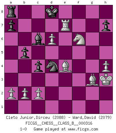 Last move : 1-0 2020 May 8 0:59:44 [Event "FICGS__CHESS__CLASS_B__000316"] [Site "FICGS"] [Date "2019.12.25"] [Round "1"] [White "Cleto Junior,Dirceu"] [Black "Ward,David"] [Result "1-0"] [WhiteElo "2088"] [BlackElo "2079"] 1.e4 e5 2.f4 exf4 3.Nf3 d6 4.d4 g5 5.g3 g4 6.Nh4 f3 7.Nc3 Nc6 8.Be3 Be7 9.Qd2 Bxh4 10.gxh4 Qxh4+ 11.Bf2 Qh6 12.Qxh6 Nxh6 13.Nd5 Kd7 14.h3 g3 15.Bxg3 Nxd4 16.Rd1 Ne6 17.Kf2 f5 18.e5 f4 19.Nxf4 Nf5 20.Bc4 Ng5 21.Rhe1 c6 22.exd6 Re8 23.Nh5 Rxe1 24.Nf6+ Kd8 25.Rxe1 Bd7 26.h4 b5 27.Bd3 Nh3+ 28.Kxf3 Nd4+ 29.Kg2 c5 30.Re7 Bc6+ 31.Kxh3 c4 32.Be4 1-0 KGA : Fischer defense Player White won this chess game. Follow this game move after move (download)I prefer to lose a really good game than to win a bad one. (David Levy) Charakterschwächen offenbaren sich normalerweise während einer Schachpartie. (Garry Kasparov) Me siento como si fuera una pieza en una partida de Ajedrez, cuando mi oponente me indica: esa pieza no puede ser movida. (Soren Kierkegaard) Nous vivons dans un monde échiquéen : chaque jour qui passe est un défi à relever. (Philosophe Sasha) God, you are such an idiot. - Actually, I thought I was more of a jerk. (Gregory House to Stacy Warner, House M.D.)