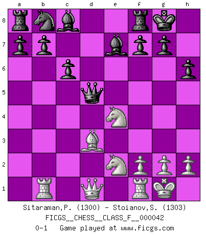 Last move : 0-1 2007 August 17 22:20:36 [Event "FICGS__CHESS__CLASS_F__000042"] [Site "FICGS"] [Date "2007.06.30"] [Round "1"] [White "Sitaraman,Praveen"] [Black "Stoianov,Stoian"] [Result "0-1"] [WhiteElo "1300"] [BlackElo "1303"] 1.d4 d5 2.e4 dxe4 3.d5 Nf6 4.c4 e6 5.Nc3 c6 6.Bg5 h6 7.Bxf6 Qxf6 8.Nxe4 Qxb2 9.Bd3 exd5 10.cxd5 Be7 11.Rb1 Qxa2 12.Ne2 O-O 13.O-O Qxd5 0-1 Blackmar gambit Kingside Castling by player Black (move 12) Kingside Castling by player White (move 13) Player Black won this chess game. Follow this game move after move (download)We cannot resist the fascination of sacrifice, since a passion for sacrifices is part of a Chessplayer's nature. (Rudolf Spielman) Wer nie einen Fehler gemacht hat, hat nie etwas Neues ausprobiert. (Albert Einstein) Si pudieramos observar el interior de la cabeza de un jugador de Ajedrez, encontraríamos ahí un mundo lleno de sentimientos, imágenes, ideas, emoción y pasión. (Alfred Binet) Pour moi, les échecs ne sont pas un jeu mais un art. (Alexandre Alekhine) Difficult things take a long time, impossible things a little longer. (Author unknown)