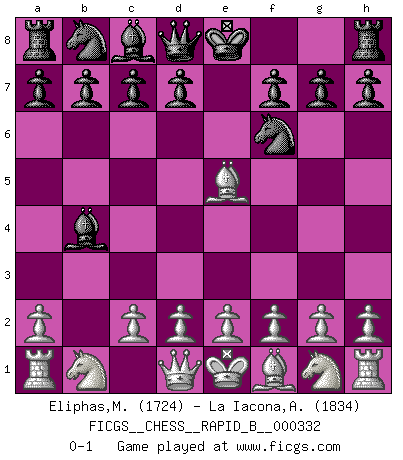 Last move : 0-1 2020 January 30 12:39:9 [Event "FICGS__CHESS__RAPID_B__000332"] [Site "FICGS"] [Date "2019.12.26"] [Round "1"] [White "Eliphas,Matthew"] [Black "La Iacona,Alessandro"] [Result "0-1"] [WhiteElo "1724"] [BlackElo "1834"] 1.b4 e5 2.Bb2 Bxb4 3.Bxe5 Nf6 0-1 This chess game has been lost on time (started : 2019.12.26 17:49:1) Polish (Sokolsky) opening Player Black won this chess game. Follow this game move after move (download)The tactician knows what to do when there is something to do; whereas the strategian knows what to do when there is nothing to do. (Gerald Abrahams) Der Bart als Geschlechtszeichen mitten im Gesicht ist obszön. Daher gefällt er den Weibern. [Zugegeben, kein Schachzitat, aber unglaublich originell] (Arthur Schopenhauer) Nos gusta pensar. (Gary Kasparov) Toutes choses étant égales, c'est la conviction qui gagne. Alliée à une volonté de vaincre, elle sert de détonateur, suscite des idées, disperse les doutes et aide à penser clairement. (Robert Fischer) Looking at the proliferation of personal web pages on the Net, it looks like very soon everyone on Earth will have 15 megabytes of fame. (M.G. Sriram)