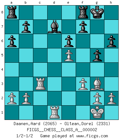 Last move : 1/2-1/2 2006 July 27 7:31:22 [Event "FICGS__CHESS__CLASS_A__000002"] [Site "FICGS"] [Date "2006.04.10"] [Round "1"] [White "Daanen,Aard"] [Black "Oltean,Dorel"] [Result "1/2-1/2"] [WhiteElo "2065"] [BlackElo "2331"] 1.e4 c6 2.c4 d5 3.cxd5 cxd5 4.exd5 Nf6 5.Bb5+ Nbd7 6.Nc3 a6 7.Be2 Nb6 8.Nf3 Nbxd5 9.d4 e6 10.O-O Bd6 11.Bg5 h6 12.Bh4 Nf4 13.Ne5 Bxe5 14.dxe5 Qxd1 15.Rfxd1 Nxe2+ 16.Nxe2 Nd5 17.Rac1 g5 18.Bg3 Bd7 19.f3 O-O 20.Nc3 Nxc3 21.Rxc3 1/2-1/2 Caro-Kann : Anti-anti-Caro-Kann defense Kingside Castling by player White (move 10) Kingside Castling by player Black (move 19) This chess game ended in a draw. Follow this game move after move (download)When you don't know what to play, wait for an idea to come into your opponent's mind. You may be sure that idea will be wrong. (Siegbert Tarrasch) Fischer: 'Remis!?' Uhlmann: 'Aber es muss doch dreimal Zugwiederholung sein!' Fischer: 'Sie nehmen das Remis an, wie ich es sage, sonst spiele ich weiter und werde Sie dann schlagen!' (Robert James Fischer) Uno por uno, yo los acribillé, mi superioridad muy pronto se volvio aparente. (Jose Capablanca) La vie et les Echecs sont tous les deux une lutte constante. (Lasker) There will be no order, only chaos. (Sol Robeson in Pi by Darren Aronofsky)
