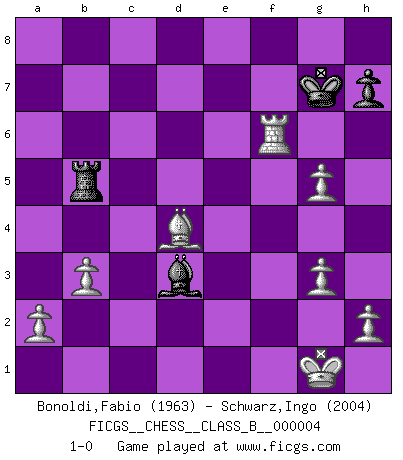 Last move : 1-0 2006 December 25 14:38:30 [Event "FICGS__CHESS__CLASS_B__000004"] [Site "FICGS"] [Date "2006.06.19"] [Round "1"] [White "Bonoldi,Fabio"] [Black "Schwarz,Ingo"] [Result "1-0"] [WhiteElo "1963"] [BlackElo "2004"] 1.c4 g6 2.Nc3 Bg7 3.g3 c5 4.Bg2 Nc6 5.e4 a6 6.Nge2 e6 7.O-O Nge7 8.d3 O-O 9.Be3 Nd4 10.f4 f5 11.e5 Nec6 12.Na4 Qa5 13.Nxd4 cxd4 14.Bd2 Qd8 15.c5 Rb8 16.Rc1 g5 17.fxg5 Bxe5 18.Qh5 Qe8 19.Qxe8 Rxe8 20.Rce1 Bc7 21.Rxf5 b5 22.cxb6 Bxb6 23.Bf4 Rb7 24.b3 Rf8 25.Rxf8+ Kxf8 26.Rc1 Ba7 27.Bxc6 dxc6 28.Rxc6 Bd7 29.Rxa6 Bb5 30.Rxe6 Bxd3 31.Bd6+ Kf7 32.Rf6+ Kg7 33.Nc5 Bxc5 34.Bxc5 Rb5 35.Bxd4 1-0 English Opening Kingside Castling by player White (move 7) Kingside Castling by player Black (move 8) Player White won this chess game. Follow this game move after move (download)Chess is so inspiring that I do not believe a good player is capable of having an evil thought during the game. (Wilhelm Steinitz) Es hat in meinem Leben Zeiten gegeben, in denen das Schachspiel, wenn nicht zum Lebenszweck, so doch zu einem regelrechten Lebensersatz geworden ist. Man fühlt sich in solchen Zeiten nicht so, als besäße man eine göttliche Gabe, sondern eher so, als sei man von ihr besessen. (Garry Kasparov) La estratégia requiere pensar, la táctica requiere observación. (Max Euwe) Si rien de grave n'est détecté lors de l'analyse d'une position, on joue alors le coup. Seconde règle de Blumenfeld. Patience, use the Force, think ! (Obi-Wan Kenobi in Star Wars ep.2)