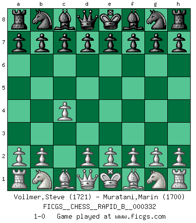 Last move : 1-0 2020 January 25 23:22:33 [Event "FICGS__CHESS__RAPID_B__000332"] [Site "FICGS"] [Date "2019.12.26"] [Round "1"] [White "Vollmer,Steve"] [Black "Muratani,Marin"] [Result "1-0"] [WhiteElo "1721"] [BlackElo "1700"] 1.c4 1-0 This chess game has been lost on time (started : 2019.12.26 17:49:1) English Opening Player White won this chess game. Follow this game move after move (download)Chess is in its essence a game, in its form an art, and in its execution a science. (Baron Tassilo) Gewinnen beim Schach fördert das Selbstvertrauen. Beim Sex spüre ich sowas nicht... (Garry Kasparov) Si pudieramos observar el interior de la cabeza de un jugador de Ajedrez, encontraríamos ahí un mundo lleno de sentimientos, imágenes, ideas, emoción y pasión. (Alfred Binet) Je menace de comprendre la position. (Anonyme) The quality of decision is like the well-timed swoop of a falcon which enables it to strike and destroy its victim. (Sun Tzu)