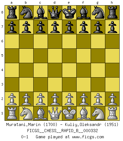Last move : 0-1 2020 January 25 23:22:33 [Event "FICGS__CHESS__RAPID_B__000332"] [Site "FICGS"] [Date "2019.12.26"] [Round "1"] [White "Muratani,Marin"] [Black "Kuliy,Oleksandr"] [Result "0-1"] [WhiteElo "1700"] [BlackElo "1951"] 0-1 This chess game has been lost on time (started : 2019.12.26 17:49:1) Player Black won this chess game. Follow this game move after move (download)Bobby just drops the pieces and they fall on the right squares. (Miguel Najdorf) Je mehr wir mit Computern analysieren, desto mehr glauben wir an Verteidigung. (Vladimir Kramnik) Bobby Fischer es el mas grande genio de Ajedrez de todos los tiempos. (Alexander Kotov) Les Echecs mettent en conflit, non pas deux intelligences, mais deux volontés. (Lasker) Internal peace cannot coexist with external war. (Don Groves)