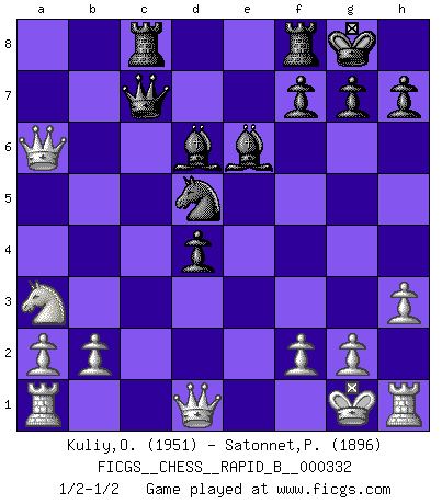 Last move : 1/2-1/2 2020 January 7 10:5:12 [Event "FICGS__CHESS__RAPID_B__000332"] [Site "FICGS"] [Date "2019.12.26"] [Round "1"] [White "Kuliy,Oleksandr"] [Black "Satonnet,Patrick"] [Result "1/2-1/2"] [WhiteElo "1951"] [BlackElo "1896"] 1.e4 c5 2.Nf3 Nc6 3.d4 cxd4 4.Nxd4 Nf6 5.Nc3 e5 6.Ndb5 d6 7.Bg5 a6 8.Na3 b5 9.Nd5 Qa5+ 10.Bd2 Qd8 11.c4 Nxe4 12.cxb5 Be6 13.Bc4 Ne7 14.Be3 Rc8 15.Bb6 Qd7 16.bxa6 Rxc4 17.a7 Nxd5 18.a8Q+ Rc8 19.Qa8a4 Nxb6 20.Qxe4 d5 21.Qxe5 Bb4+ 22.Kf1 O-O 23.h3 Bd6 24.Qe5e2 d4 25.Kg1 Nd5 26.Qb5 Qc7 27.Qa6 Qb8 28.Qb5 Qc7 29.Qa6 1/2-1/2 Sicilian : Pelikan (Lasker/Sveshnikov) variation Promotion Queen by player White (move 18) Kingside Castling by player Black (move 22) This chess game ended in a draw. Follow this game move after move (download)A good sacrifice is one that is not necessarily sound but leaves your opponent dazed and confused. (Rudolph Spielmann) Wenn ein Kopf und ein Buch zusammenstoßen und es klingt hohl, ist es denn allemal im Buche? (Georg Christoph Lichtenberg) Tu eres para mi la Reina en d8 y yo soy el Peón en d7!!. (GM Eduard Gufeld) Les échecs sont utiles à l'exercice de la faculté de penser et à celle de l'imagination. Car nous devons posséder une méthode élaborée pour atteindre des buts partout où nous devons conduire notre raison. (Leibnitz) The various flowers seem good to different people. (Chinese proverb)