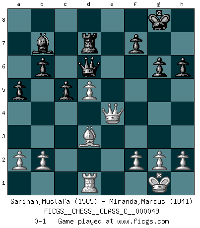 Last move : 0-1 2008 January 2 22:19:44 [Event "FICGS__CHESS__CLASS_C__000049"] [Site "FICGS"] [Date "2007.07.01"] [Round "1"] [White "Sarihan,Mustafa"] [Black "Miranda,Marcus"] [Result "0-1"] [WhiteElo "1585"] [BlackElo "1841"] 1.d4 Nf6 2.c4 e6 3.Nf3 d5 4.Nc3 Be7 5.Bg5 O-O 6.e3 h6 7.Bh4 b6 8.Rc1 Bb7 9.Be2 Nbd7 10.O-O c5 11.cxd5 Nxd5 12.Bxe7 Qxe7 13.Nxd5 Bxd5 14.Qc2 a5 15.Rfd1 Rac8 16.e4 Bb7 17.d5 exd5 18.exd5 Qf6 19.Bc4 Rcd8 20.Re1 Rfe8 21.Rxe8+ Rxe8 22.Rd1 Rd8 23.Qe2 Qd6 24.Nd2 Nf6 25.Ne4 Nxe4 26.Qxe4 Rd7 27.Bd3 g6 0-1 This chess game has been lost on time (started : 2007.07.01 1:42:36) Queen's pawn game Kingside Castling by player Black (move 5) Kingside Castling by player White (move 10) Player Black won this chess game. Follow this game move after move (download)I know people who have all the will in the world, but still can't play good Chess. (Bobby Fischer) Meine Liebe ist Schach, Schach, Schach. Ich muss jeden Tag Schach spielen, deshalb fühle ich mich so stark. (Miguel Najdorf) El estómago es una parte esencial del maestro de Ajedrez. (Bent Larsen) On n'a jamais que l'âge auquel on a commence à jouer aux échecs car après on cesse de vieillir. (Capablanca) The Internet is the world's largest library. It's just that all the books are on the floor. (John Allen Paulos)