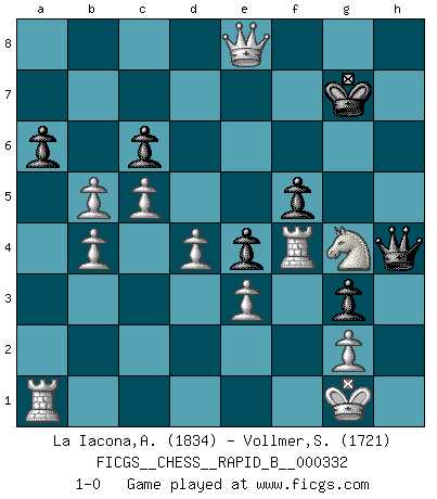 Last move : 1-0 2020 March 10 0:6:9 [Event "FICGS__CHESS__RAPID_B__000332"] [Site "FICGS"] [Date "2019.12.26"] [Round "1"] [White "La Iacona,Alessandro"] [Black "Vollmer,Steve"] [Result "1-0"] [WhiteElo "1834"] [BlackElo "1721"] 1.d4 Nf6 2.c4 e6 3.Nc3 Bb4 4.Qc2 O-O 5.a3 Bxc3+ 6.Qxc3 d5 7.Bg5 c6 8.e3 Nbd7 9.Nf3 h6 10.Bh4 g5 11.Bg3 Ne4 12.Qc2 Ndf6 13.Bd3 Bd7 14.Be5 Qe7 15.O-O Rfc8 16.c5 b6 17.b4 Be8 18.h3 b5 19.a4 a6 20.Bh2 g4 21.Ne5 h5 22.Bf4 Nh7 23.f3 f5 24.hxg4 Qh4 25.fxe4 dxe4 26.Qa2 Qe7 27.Bc2 hxg4 28.Bb3 Ng5 29.Bxg5 Qxg5 30.Bxe6+ Kg7 31.Rf4 Bg6 32.Bxc8 Rxc8 33.axb5 g3 34.Qe6 Be8 35.Qxc8 Qh5 36.Ng4 Qh4 37.Qxe8 1-0 Nimzo-Indian : Classical variation Kingside Castling by player Black (move 4) Kingside Castling by player White (move 15) Player White won this chess game. Follow this game move after move (download)Human affairs are like a Chess game: only those who do not take it seriously can be called good players. (Hung Tzu Ch'eng) Der zweitbeste Zug ist oft der einzig richtige. (Savielly Grigorievitsch Tartakower) Una compensación adecuada por un sacrificio es tener una combinación sólida que conduce a una posición ganadora; una compensación adecuada por una metida de pata es dejar a tu oponente arrebatar una derrota de las fauces de la victoria. (Bruce A. Moon) Dieu déplace le joueur, et celui-ci la pièce. Quel Dieu derrière Dieu commence donc la trame ? Arturo Perez-Reverte (prix de littérature policière 1993). Locking firmely the window serves nothing, only small thiefs pass through there, the big thiefs enter through the front door. (Luc-Olivier Leclerc)