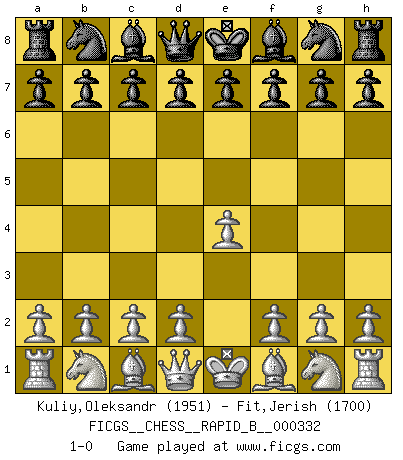 Last move : 1-0 2020 January 26 12:31:51 [Event "FICGS__CHESS__RAPID_B__000332"] [Site "FICGS"] [Date "2019.12.26"] [Round "1"] [White "Kuliy,Oleksandr"] [Black "Fit,Jerish"] [Result "1-0"] [WhiteElo "1951"] [BlackElo "1700"] 1.e4 1-0 This chess game has been lost on time (started : 2019.12.26 17:49:1) King's pawn Opening Player White won this chess game. Follow this game move after move (download)Any material change in a position must come about by mate, a capture, or a Pawn promotion. (Purdy) Ich würde die 30 stärksten Spieler der USA im Simultanspiel besiegen. (José Raúl Capablanca) En posiciones complicadas, Bobby Fischer pocas veces tuvo que temer de cualquiera. (Paul Keres) Ce qui est bien, c'est d'avoir tout un tas de pièces en prise : l'adversaire ne peut en prendre qu'une à la fois. Cité par Thierry Audin. I have opinions of my own - strong opinions - but I don't always agree with them. (George Bush)