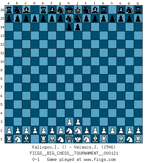 Last move : 0-1 2020 January 26 12:31:51 [Event "FICGS__BIG_CHESS__TOURNAMENT__000121"] [Site "FICGS"] [Date "2019.12.27"] [Round "1"] [White "Kalixpov,Ivan"] [Black "Velasco,Jose Maria"] [Result "0-1"] [WhiteElo ""] [BlackElo "1946"] 0-1 This big chess game has been lost on time (started : 2019.12.27 0:46:28) Follow this game move after move (download)Via the squares on the chessboard, the Indians explain the movement of time and the age, the higher influences which control the world and the ties which link Chess with the human soul. (Al-Masudi) Die Partien sind immer verschieden, die Interviews immer die gleichen. (Garry Kasparov) Cuando me preguntan: -¿Cual es el secreto que te hace hacer mejores movidas que tus oponentes?, Yo respondo: Me da gusto que me pregunten eso, porque, como veran, hay una simple razón. Yo pienso mis propias movidas y dejo a mi oponente que el piense las suyas. (Alexander Alekhine) Les sacrifices démontrent seulement que quelqu'un a gaffé. (Savielly Tartacover) There's no money in correspondence chess. (John Knudsen)