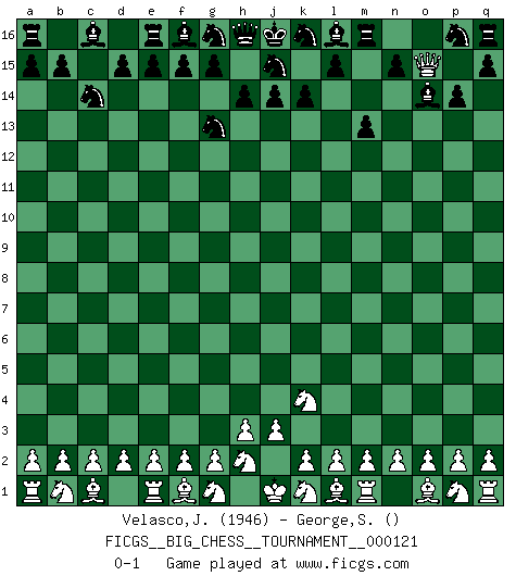 Last move : 0-1 2019 December 29 22:26:31 [Event "FICGS__BIG_CHESS__TOURNAMENT__000121"] [Site "FICGS"] [Date "2019.12.27"] [Round "1"] [White "Velasco,Jose Maria"] [Black "George,Sebastine"] [Result "0-1"] [WhiteElo "1946"] [BlackElo ""] 1.j2-k4 p15-p14 2.h1-o7 h15-g13 3.o7-c7 k15-k14 4.c7-c15 o16-p15 5.c15-c11 b16-c14 6.c11-o11 m15-m13 7.o11-o15 p15-o14 0-1 Follow this game move after move (download)The older I grow, the more I value pawns. (Paul Keres) Rauchen ist dem Schachspieler bei seiner Arbeit, also im Wettkampf, untersagt. (Viktor Kortschnoi) La última cosa en que Fischer estaba interesado era en tonterías, siempre y cuando el Ajedrez estuviera involucrado. (Elie Agur) Si rien de grave n'est détecté lors de l'analyse d'une position, on joue alors le coup. Seconde règle de Blumenfeld. Everything in life is luck. (Donald Trump)