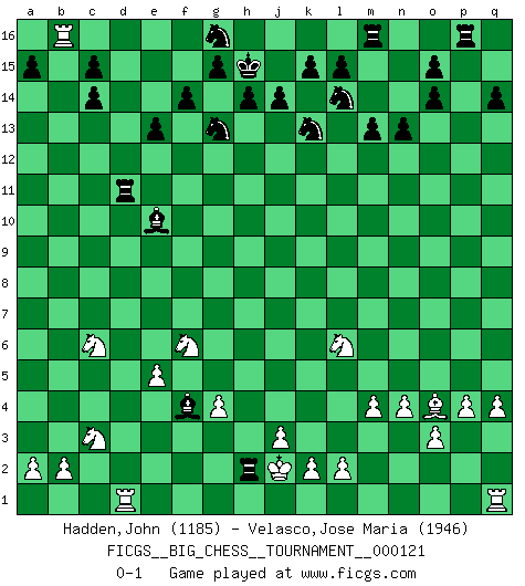 Last move : 0-1 2020 March 4 0:23:0 [Event "FICGS__BIG_CHESS__TOURNAMENT__000121"] [Site "FICGS"] [Date "2019.12.27"] [Round "1"] [White "Hadden,John"] [Black "Velasco,Jose Maria"] [Result "0-1"] [WhiteElo "1185"] [BlackElo "1946"] 1.g1-f3 j15-k13 2.n2-n3 h16-o10 3.p1-o3 o10-f2 4.h2-g4 f2-o10 5.b1-c3 n15-n13 6.k1-l3 o16-d6 7.g2-g3 m15-m13 8.j2-k4 d6-g3 9.g4-h2 g3-e1 10.f3-e1 o10-e1 11.f1-g2 e1-h1 12.g2-h1 e15-e13 13.d2-d3 l16-p12 14.h1-f3 p16-o14 15.m2-m3 d15-d13 16.m3-m4 f16-b12 17.l3-j2 c16-m7 18.l1-m2 b16-c14 19.o3-n5 m7-q11 20.o1-j6 p12-o13 21.f3-g4 o13-j8 22.o2-o3 h15-g13 23.j6-k7 j8-m11 24.k7-d13 a16-d16 25.d13-c14 b15-c14 26.c1-p13 q15-q14 27.p13-o14 p15-o14 28.e2-e4 q16-p16 29.p2-p4 m11-o9 30.q2-q4 d16-d12 31.a1-f1 b12-g7 32.f1-f7 g7-b12 33.h2-k3 e16-d16 34.n3-n4 o9-l12 35.f7-j7 b12-h6 36.j7-j6 h6-p13 37.j2-h4 q11-p12 38.j6-j5 p12-g4 39.h3-g4 d12-f12 40.m2-o4 f12-f2 41.n5-l6 f2-c2 42.j5-b5 d16-d3 43.k3-h2 d3-d2 44.h4-f3 d2-d11 45.j1-j2 f15-f14 46.m1-d1 l12-g8 47.b5-b16 j16-h15 48.k4-h5 k16-l14 49.h5-f6 g8-e10 50.f3-d4 c2-f2 51.e4-e5 p13-f4 52.d4-c6 f2-h2 0-1 Follow this game move after move (download)Fischer is the strongest player in the world. In fact, the strongest player who ever lived. (Larry Evans) Im Reiche der Wirklichkeit ist man nie so glücklich wie im Reiche der Gedanken. (Arthur Schopenhauer) No es suficiente ser un buen jugador, se debe también de jugar bién. (Siegbert Tarrasch) Le jeu d'échecs fait naître et fortifie en nous plusieurs qualités précieuses dans le cours de l'existence, telles que la prévoyance, la circonspection, la prudence, et la persévérance. (Benjamin Franklin - 1783, la morale des échecs) There is no instance of a country having benefited from prolonged warfare. (Sun Tzu)