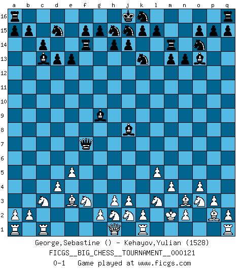 Last move : 0-1 2020 April 4 12:41:13 [Event "FICGS__BIG_CHESS__TOURNAMENT__000121"] [Site "FICGS"] [Date "2019.12.27"] [Round "1"] [White "George,Sebastine"] [Black "Kehayov,Yulian"] [Result "0-1"] [WhiteElo ""] [BlackElo "1528"] 1.p2-p3 j15-k13 2.o1-p2 h16-o10 3.o2-o4 o10-f2 4.g1-f3 f2-c5 5.b1-c3 m15-m13 6.d2-d4 c5-l5 7.p2-n4 e15-e13 8.m2-m4 l5-e11 9.n4-p2 c15-c14 10.e2-e4 n15-n13 11.p1-o3 f16-c13 12.c1-e3 p16-o14 13.l1-m2 o16-g9 14.m2-n3 d15-d13 15.l2-l4 c16-k9 16.e4-e5 l16-o13 17.f1-c4 b16-d15 18.k1-l3 m16-m14 19.m1-m2 e16-e14 20.l4-l5 k9-c2 21.j1-k1 e11-c11 22.k1-l2 c11-c4 23.m2-m1 c2-j8 24.m1-k1 e14-f14 25.e1-c1 c4-f7 26.l2-m2 g16-j15 0-1 This big chess game has been lost on time (started : 2019.12.27 0:46:28) Follow this game move after move (download)You know you're going to lose. Even when I was ahead I knew I was going to lose. - On playing against Fischer. (Andrew Soltis) Ich organisiere ein großes Turnier, was mich etwa 120000 Dollar kostet. Ich denke, das ist das erste Mal in der Schachgeschichte, daß ein Schachgroßmeister auch als Mäzen auftritt. (Miguel Najdorf) Una compensación adecuada por un sacrificio es tener una combinación sólida que conduce a una posición ganadora; una compensación adecuada por una metida de pata es dejar a tu oponente arrebatar una derrota de las fauces de la victoria. (Bruce A. Moon) Même si vous avez un bon coup à faire, regardez toujours s'il n'y en a pas un qui lui soit préférable. (Pedro Damiano) 'preceded by its own quotation yields a falsehood' preceded by its own quotation yields a falsehood. (W. V. O. Quine - Set Theory And Its Logic, 1953)