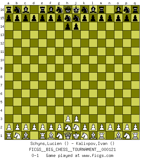 Last move : 0-1 2020 January 26 12:31:51 [Event "FICGS__BIG_CHESS__TOURNAMENT__000121"] [Site "FICGS"] [Date "2019.12.27"] [Round "1"] [White "Schyns,Lucien"] [Black "Kalixpov,Ivan"] [Result "0-1"] [WhiteElo ""] [BlackElo ""] 0-1 This big chess game has been lost on time (started : 2019.12.27 0:46:28) Follow this game move after move (download)Fischer Chess play was always razor-sharp, rational and brilliant. One of the best ever. (Dave Regis) Verschiedene, sehr schätzbare und im Laufe des Lebens nützliche Eigenschaften des Geistes können durch das Schachspiel erworben und gekräftigt werden, so dass sie zu Gewohnheiten werden, die uns nie im Stich lassen. (Benjamin Franklin) Los libros de Ajedrez deben de usarse igual como usamos los anteojos: para mejorar la vista, aunque algunos jugadores los quieren usar como si ellos les otorgaran la vision. (José Raúl Capablanca) L'attaque fait le spectacle, la défense gagne les matchs. (Dicton footballistique) Lottery : A tax on people who are bad at math. (Author unknown)