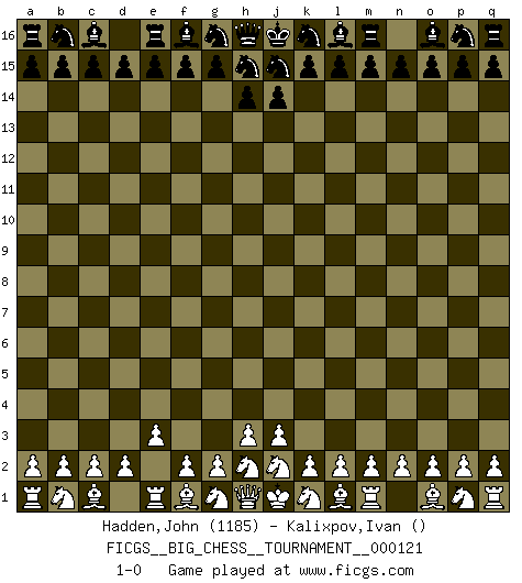 Last move : 1-0 2020 January 26 12:31:51 [Event "FICGS__BIG_CHESS__TOURNAMENT__000121"] [Site "FICGS"] [Date "2019.12.27"] [Round "1"] [White "Hadden,John"] [Black "Kalixpov,Ivan"] [Result "1-0"] [WhiteElo "1185"] [BlackElo ""] 1.e2-e3 1-0 This big chess game has been lost on time (started : 2019.12.27 0:46:28) Follow this game move after move (download)Adequate compensation for a sacrifice is having a sound combination leading to a winning position; adequate compensation for a blunder is having your opponent snatch defeat from the jaws of victory. (Bruce A. Moon) Es liegt in der Natur, vernüftig zu denken und unlogisch zu handeln. (Anatole France) El Ajedrez tiene tanto misterio como las mujeres. (Purdy) Le profane ne songe pas à la somme de jouissance dont il se prive, qui méconnaît ce jeu aux ressources aussi variées que passionnantes. (Jean-Marie Jeanton-Lamarche) We need strong personalities and only one world champion to attract sponsors. (Anatoly Karpov)