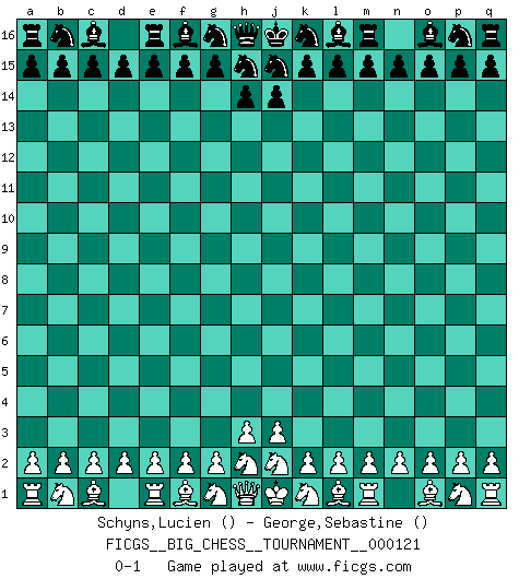 Last move : 0-1 2020 January 26 12:31:51 [Event "FICGS__BIG_CHESS__TOURNAMENT__000121"] [Site "FICGS"] [Date "2019.12.27"] [Round "1"] [White "Schyns,Lucien"] [Black "George,Sebastine"] [Result "0-1"] [WhiteElo ""] [BlackElo ""] 0-1 This big chess game has been lost on time (started : 2019.12.27 0:46:28) Follow this game move after move (download)An attack on the wing should be met by play in the center. (Nimzovitch) Frage: Was machen Sie mit den Preisen? Anwort: Ich habe Angst, dass meine Freundin davon neue Kleider kauft. (Loek van Wely) Uno por uno, yo los acribillé, mi superioridad muy pronto se volvio aparente. (Jose Capablanca) 'L'échange des dames est un coup dur pour les deux adversaires...' Un journaliste lors d'une partie du match Spassky-Fischer Coffee just isn't my cup of tea. (Unknown)
