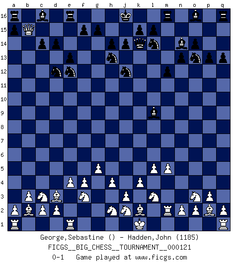 Last move : 0-1 2020 March 30 18:47:40 [Event "FICGS__BIG_CHESS__TOURNAMENT__000121"] [Site "FICGS"] [Date "2019.12.27"] [Round "1"] [White "George,Sebastine"] [Black "Hadden,John"] [Result "0-1"] [WhiteElo ""] [BlackElo "1185"] 1.p2-p3 b16-c14 2.o1-p2 d15-d14 3.b2-b3 m15-m14 4.c1-b2 o15-o14 5.f2-f4 k16-l14 6.e2-e4 h15-g13 7.b1-c3 n15-n13 8.p1-o3 e15-e13 9.l2-l4 g16-f14 10.g1-f3 l16-n14 11.f1-d3 j15-h13 12.k1-l3 f16-e15 13.k2-k4 m14-m13 14.l1-k2 p16-n15 15.m2-m4 m13-m12 16.h1-f1 n15-o13 17.m1-m2 c16-e14 18.f1-f2 q15-q13 19.m4-m5 p15-p13 20.l4-l5 c14-d12 21.g2-g4 f14-e12 22.h3-h4 g13-j12 23.j1-k1 c15-c14 24.f2-b6 h16-k14 25.b6-b15 e15-l9 26.g4-g5 e14-c16 0-1 This big chess game has been lost on time (started : 2019.12.27 0:46:28) Follow this game move after move (download)Half the variations which are calculated in a tournament game turn out to be completely superfluous. Unfortunately, no one knows in advance which half. (Jan Tinman) Eine Person mit durchschnittlichem IQ kann etwa eine ELO von 2000 erreichen. (Jonathan Levitt) En un gambito tu regalas un Peón por el bién de tomar un juego perdido. (Samuel Standige Boden) Pour moi, les échecs ne sont pas un jeu mais un art. (Alexandre Alekhine) The age of a woman doesn't mean a thing. The best tunes are played on the oldest fiddles. (Ralph Waldo Emerson)