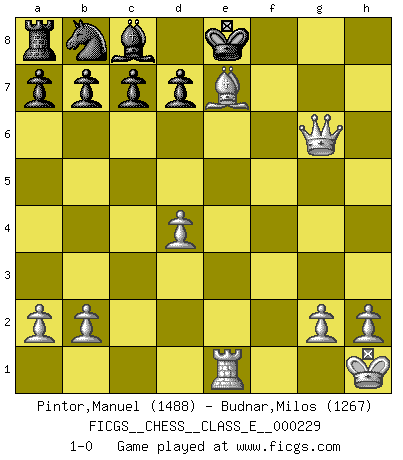 Last move : 1-0 2020 January 16 0:31:32 [Event "FICGS__CHESS__CLASS_E__000229"] [Site "FICGS"] [Date "2019.12.27"] [Round "1"] [White "Pintor,Manuel"] [Black "Budnar,Milos"] [Result "1-0"] [WhiteElo "1488"] [BlackElo "1267"] 1.e4 e5 2.f4 exf4 3.Nf3 g5 4.Bc4 g4 5.O-O gxf3 6.Qxf3 Bc5+ 7.Kh1 Qg5 8.Nc3 f5 9.exf5 Qxf5 10.Nd5 Bd6 11.d4 Ne7 12.Nxf4 Qxc2 13.Bb3 Qf5 14.Qe2 Rf8 15.Bc2 Qf6 16.Bd2 Bxf4 17.Rxf4 Qg7 18.Qh5+ Ng6 19.Bxg6+ hxg6 20.Re1+ Kd8 21.Rxf8+ Qxf8 22.Bg5+ Qe7 23.Bxe7+ Ke8 24.Qxg6+ 1-0 KGA : Muzio gambit Kingside Castling by player White (move 5) Player White won this chess game. Follow this game move after move (download)Fischer was a master of clarity and a king of artful positioning. His opponents would see where he was going but were powerless to stop him. (Bruce Pandolfini) Wir irren allesamt, nur jeder irrt anders. (Georg Christoph Lichtenberg) Tu eres para mi la Reina en d8 y yo soy el Peón en d7!!. (GM Eduard Gufeld) Toutes choses étant égales, c'est la conviction qui gagne. Alliée à une volonté de vaincre, elle sert de détonateur, suscite des idées, disperse les doutes et aide à penser clairement. (Robert Fischer) When I took office, only high energy physicists had ever heard of what is called the World Wide Web... Now even my cat has its own page. (Bill Clinton, 1996)