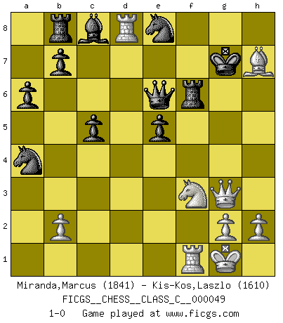 Last move : 1-0 2007 September 1 3:31:2 [Event "FICGS__CHESS__CLASS_C__000049"] [Site "FICGS"] [Date "2007.07.01"] [Round "1"] [White "Miranda,Marcus"] [Black "Kis-Kos,Laszlo"] [Result "1-0"] [WhiteElo "1841"] [BlackElo "1610"] 1.d4 Nf6 2.c4 c5 3.d5 e6 4.Nc3 exd5 5.cxd5 d6 6.e4 g6 7.f4 Bg7 8.Bb5+ Nfd7 9.a4 O-O 10.Nf3 Na6 11.O-O Nc7 12.Bd3 a6 13.Qe1 Rb8 14.e5 Nb6 15.f5 dxe5 16.fxg6 fxg6 17.Bg5 Qd6 18.Ne4 Qxd5 19.Rd1 Nxa4 20.Nf6+ Bxf6 21.Bxf6 Rxf6 22.Bxg6 Qe6 23.Rd8+ Kg7 24.Bxh7 Ne8 25.Qg3+ 1-0 Benoni : pawn storm variation Kingside Castling by player Black (move 9) Kingside Castling by player White (move 11) Player White won this chess game. Follow this game move after move (download)My opponents make good moves too. Sometimes I don't take these things into consideration. (Bobby Fischer) Wie gewinnt Tal? Er entwickelt alle seine Figuren in die Brettmitte und opfert sie dann irgendwo. (Robert James Fischer) En el Ajedrez, tal como es jugado por los Maestros, practicamente la suerte es eliminada. (Emanuel Lasker) Le jeu d'échecs fait naître et fortifie en nous plusieurs qualités précieuses dans le cours de l'existence, telles que la prévoyance, la circonspection, la prudence, et la persévérance. (Benjamin Franklin - 1783, la morale des échecs) When you stop learning you start dying. (Scott Adams)