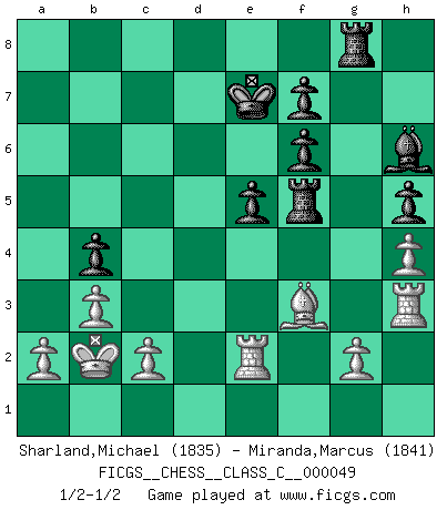 Last move : 1/2-1/2 2007 November 1 16:11:45 [Event "FICGS__CHESS__CLASS_C__000049"] [Site "FICGS"] [Date "2007.07.01"] [Round "1"] [White "Sharland,Michael"] [Black "Miranda,Marcus"] [Result "1/2-1/2"] [WhiteElo "1835"] [BlackElo "1841"] 1.e4 c5 2.Nf3 d6 3.d4 cxd4 4.Nxd4 Nf6 5.Nc3 Nc6 6.Bg5 e6 7.Qd2 a6 8.O-O-O Bd7 9.f4 b5 10.Bxf6 gxf6 11.Kb1 Qb6 12.Nce2 Rc8 13.f5 Nxd4 14.Nxd4 e5 15.Ne2 b4 16.Ng3 h5 17.h4 Ke7 18.Qd5 Qc6 19.Qxc6 Rxc6 20.Rh3 Rc5 21.Bxa6 Rg8 22.Rg1 d5 23.Bb7 dxe4 24.Bxe4 Rc4 25.b3 Rd4 26.Bf3 Bh6 27.Re1 Rf4 28.Kb2 Bxf5 29.Nxf5+ Rxf5 30.Re2 1/2-1/2 Sicilian : Richter-Rauzer, Rauzer attack, 7...a6 Queenside Castling by player White (move 8) This chess game ended in a draw. Follow this game move after move (download)A player surprised is half beaten. (Proverb) Obwohl ich vom Stil her kaum zu den Priestern der Schachkunst gezählt werde, halte ich Schach doch für eine Kunst. (Tigran Petrosjan) Durante una competencia de Ajedrez, un Maestro de Ajedrez deberá ser una combinación de presa de caza y un Monge. (Alexander Alekhine) La menace est plus forte que l'exécution. (Aaron Nimzovitch) Humor is by far the most significant activity of the human brain. (Edward De Bono)