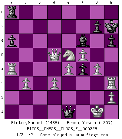 Last move : 1/2-1/2 2020 January 6 17:14:57 [Event "FICGS__CHESS__CLASS_E__000229"] [Site "FICGS"] [Date "2019.12.27"] [Round "1"] [White "Pintor,Manuel"] [Black "Bromo,Alexis"] [Result "1/2-1/2"] [WhiteElo "1488"] [BlackElo "1207"] 1.e4 e5 2.f4 d6 3.Nf3 Nc6 4.Bc4 h6 5.O-O Bg4 6.c3 Nf6 7.d3 Be7 8.Qb3 O-O 9.f5 Bxf3 10.Rxf3 Na5 11.Qa4 Nxc4 12.Qxc4 a6 13.Rg3 Kh8 14.Nd2 b5 15.Qb3 c5 16.Nf3 Nh5 17.Rh3 Nf4 18.Bxf4 exf4 19.a4 bxa4 20.Rxa4 Qd7 21.Qa3 Qa7 22.Qa2 Bf6 23.Kh1 Rfe8 24.Nd2 Bg5 25.Nc4 d5 26.Nd6 Re7 27.Qxd5 Qd7 28.b3 Bf6 29.Qxc5 Re5 30.Qb4 Be7 31.Nxf7+ Kh7 32.Nxe5 Qc7 33.Qd4 Bf6 34.Qd5 Qxc3 35.g4 Qe1+ 36.Kg2 Qe2+ 37.Kg1 Qe1+ 1/2-1/2 King's gambit Kingside Castling by player White (move 5) Kingside Castling by player Black (move 8) This chess game ended in a draw. Follow this game move after move (download)The beauty of a move lies not in its' appearance but in the thought behind it. (Siegbert Tarrasch) Wenn ich mich einlogge, glauben die Leute gewöhnlich nicht, dass ich es selbst bin und sie fangen an, mir dumme Fragen zu stellen. Und wenn sie es glauben, stellen sie wieder andere dumme Fragen. (Judith Polgar) El Ajedrez es de 30 a 40 por ciento psicología. Uno no cuenta con esto cuando se juega contra una computadora. No lo puedo confundir. (Judith Polgar) Le profane ne songe pas à la somme de jouissance dont il se prive, qui méconnaît ce jeu aux ressources aussi variées que passionnantes. (Jean-Marie Jeanton-Lamarche) I just play for fun. (Anna Kournikova)